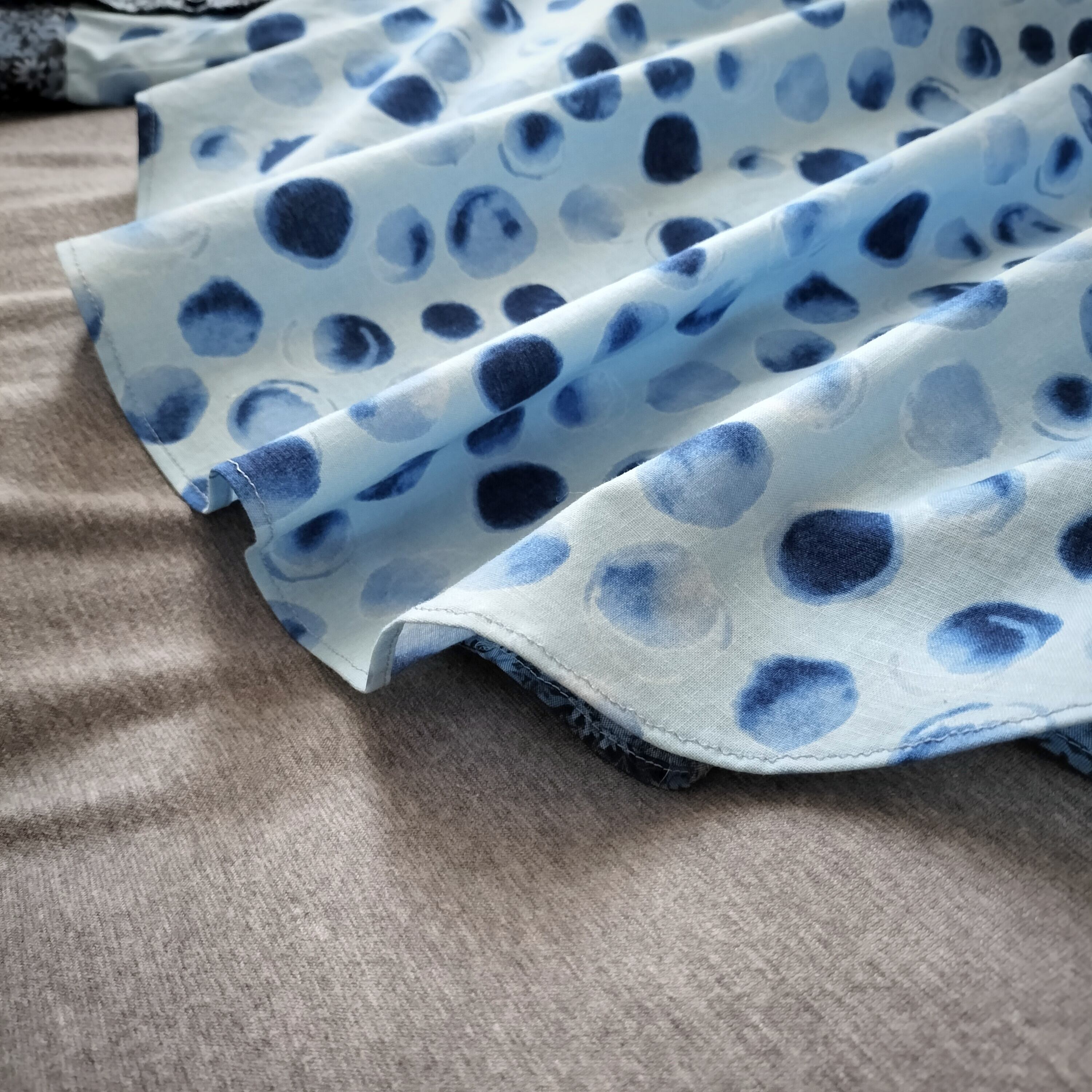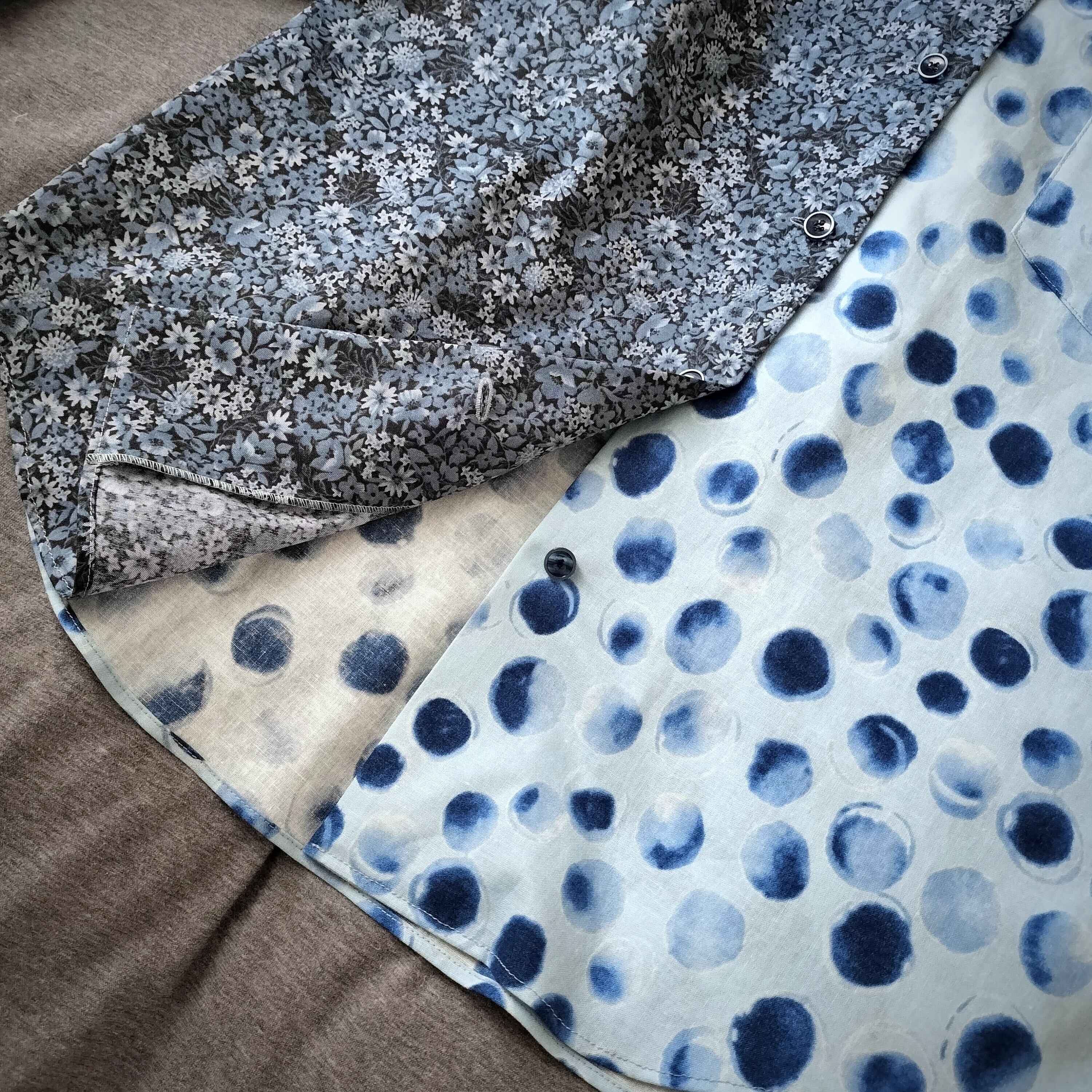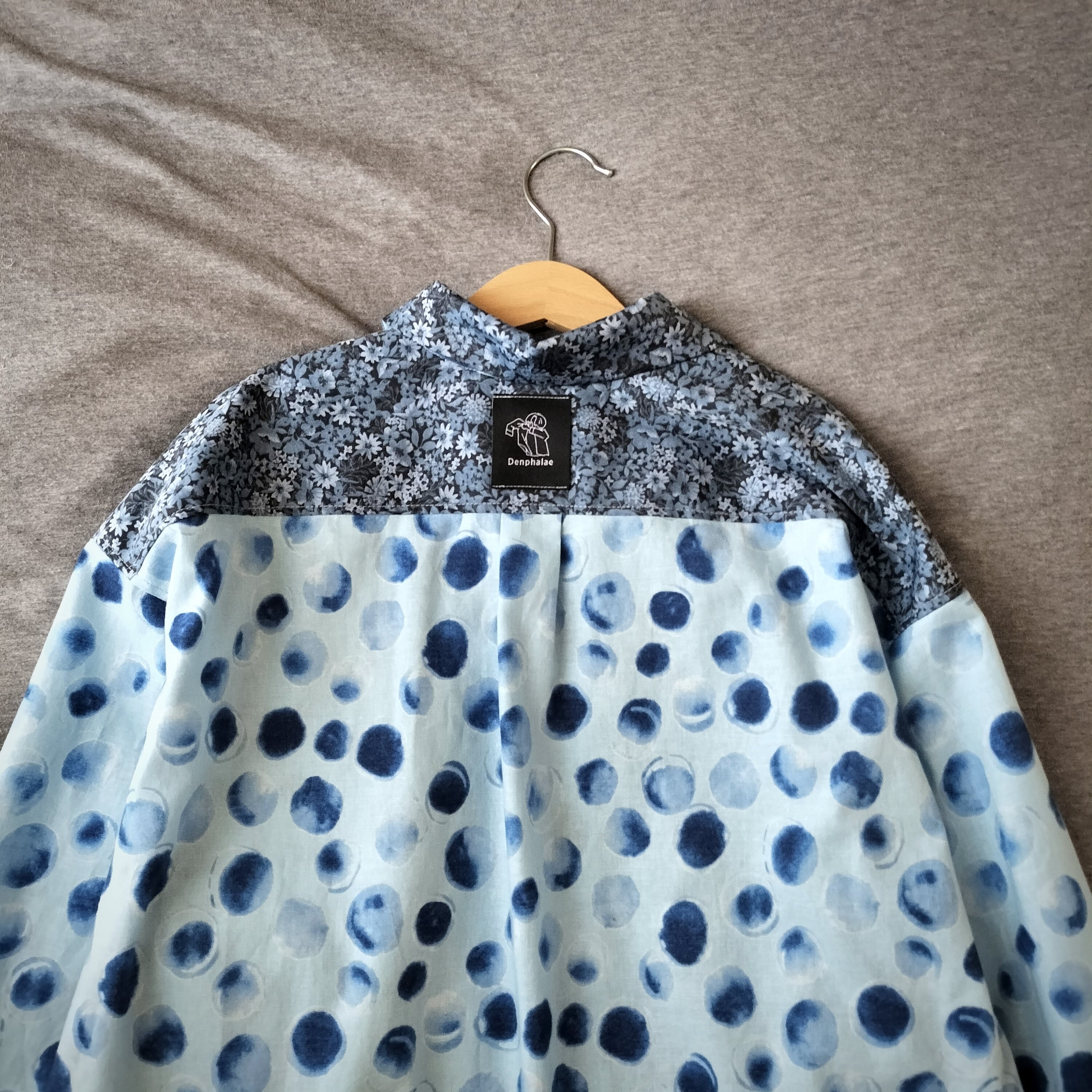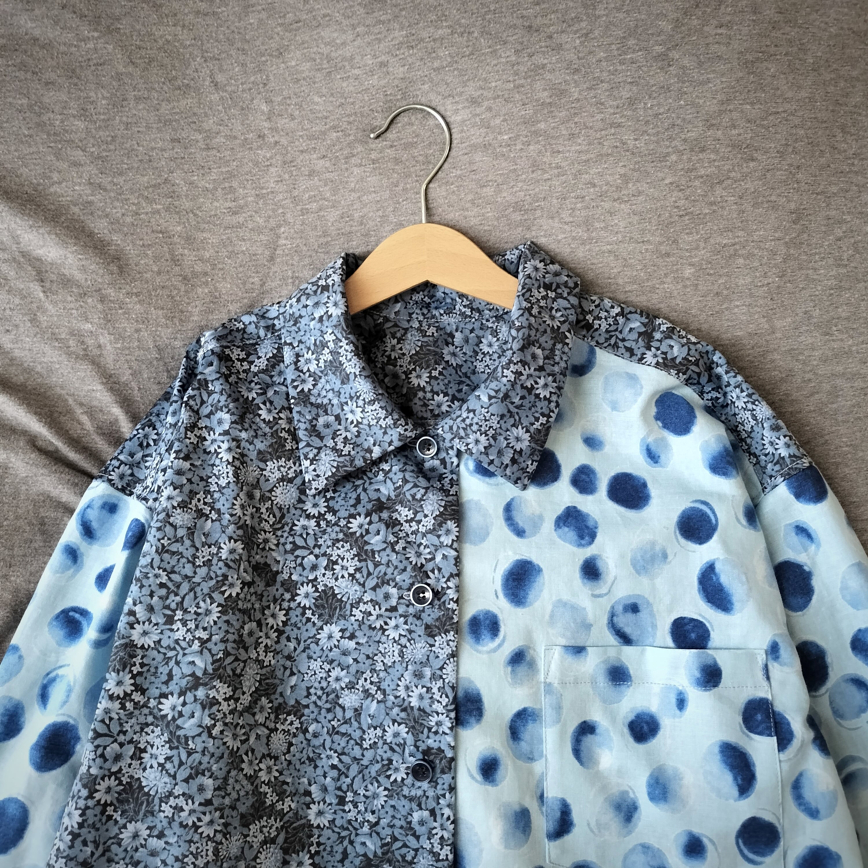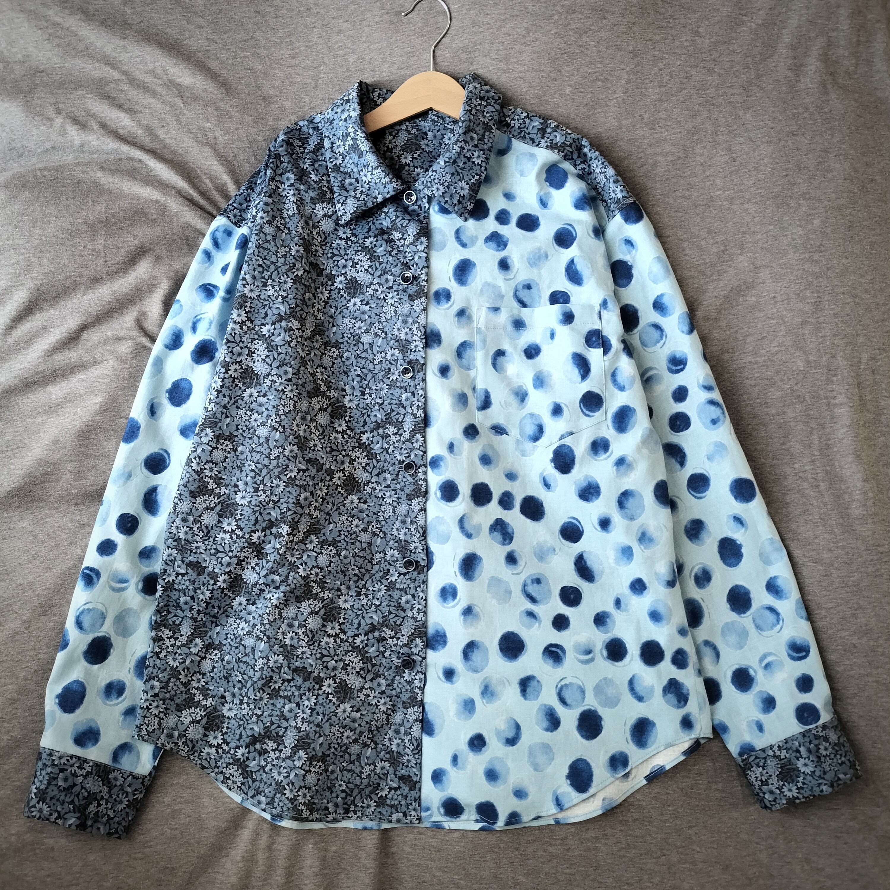 水玉柄 花柄 パッチワーク ブルーシャツ 長袖シャツ シャツ 柄シャツ 個性的 おしゃれ 一点物 男女兼用 古着風 メンズファッション グランパコア