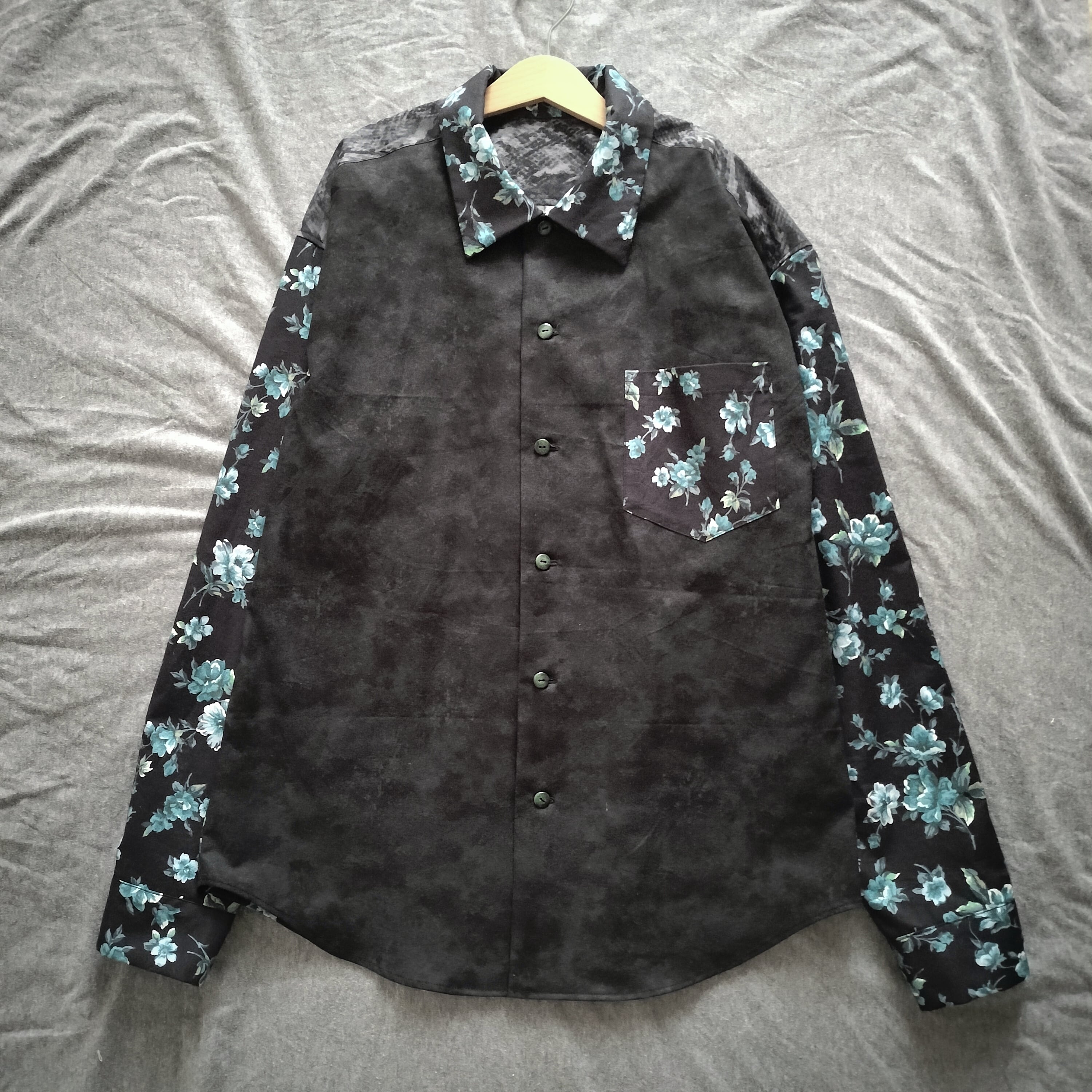 花柄 ムラ染め 長袖シャツ 黒 柄シャツ 個性的 おしゃれ 一点物 男女兼用 綿 古着風 メンズファッション レトロ