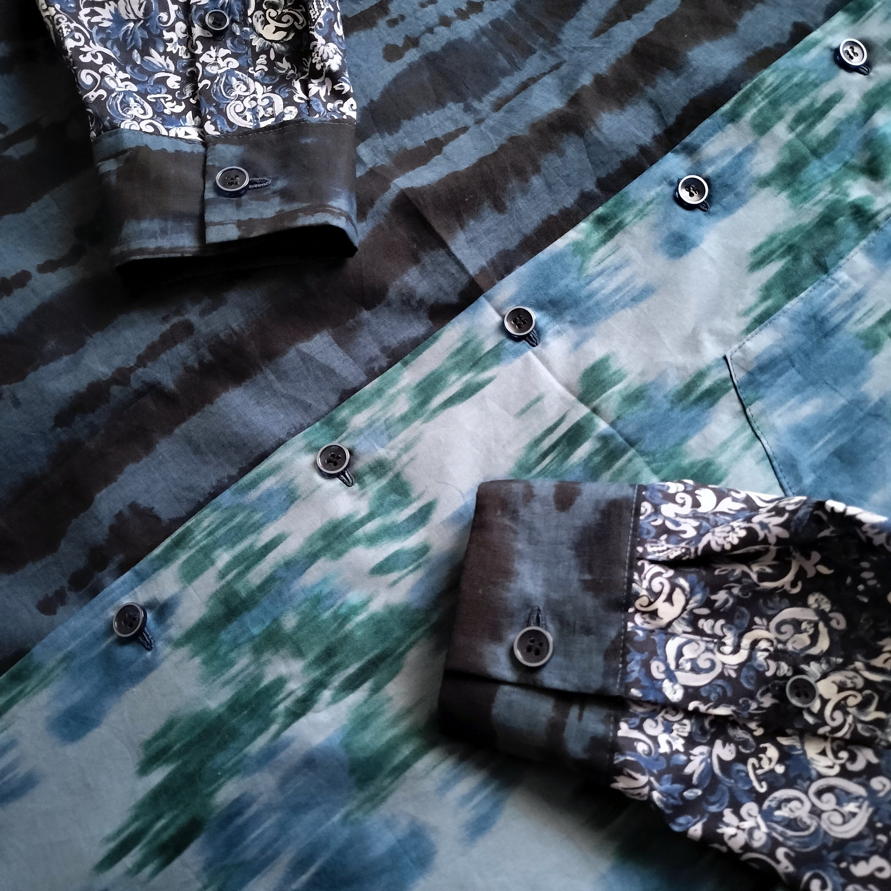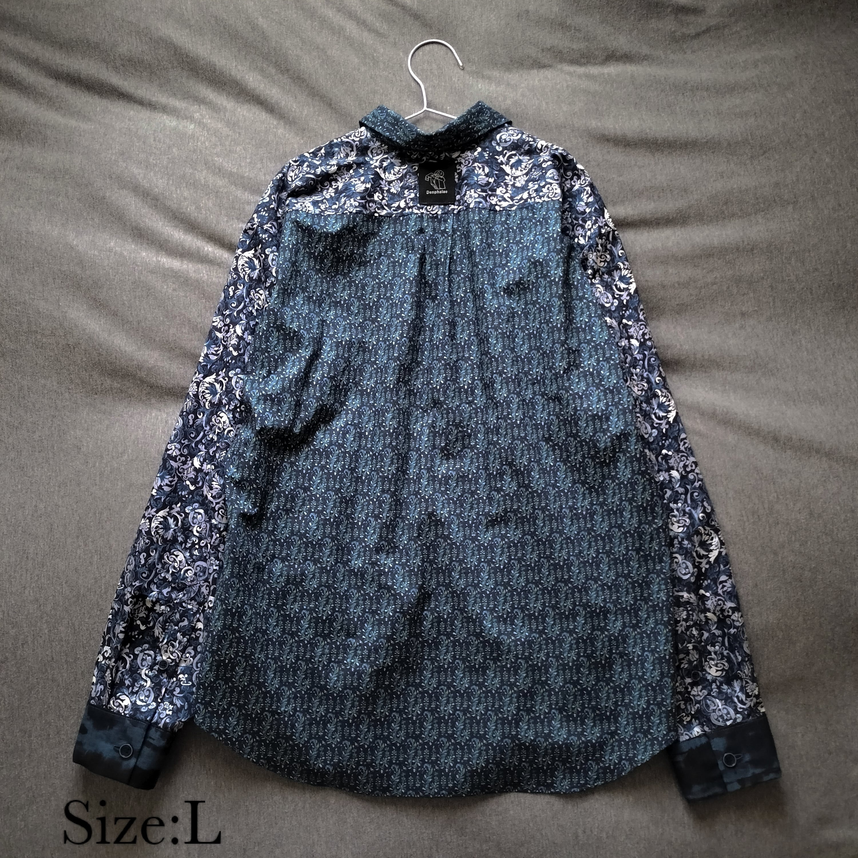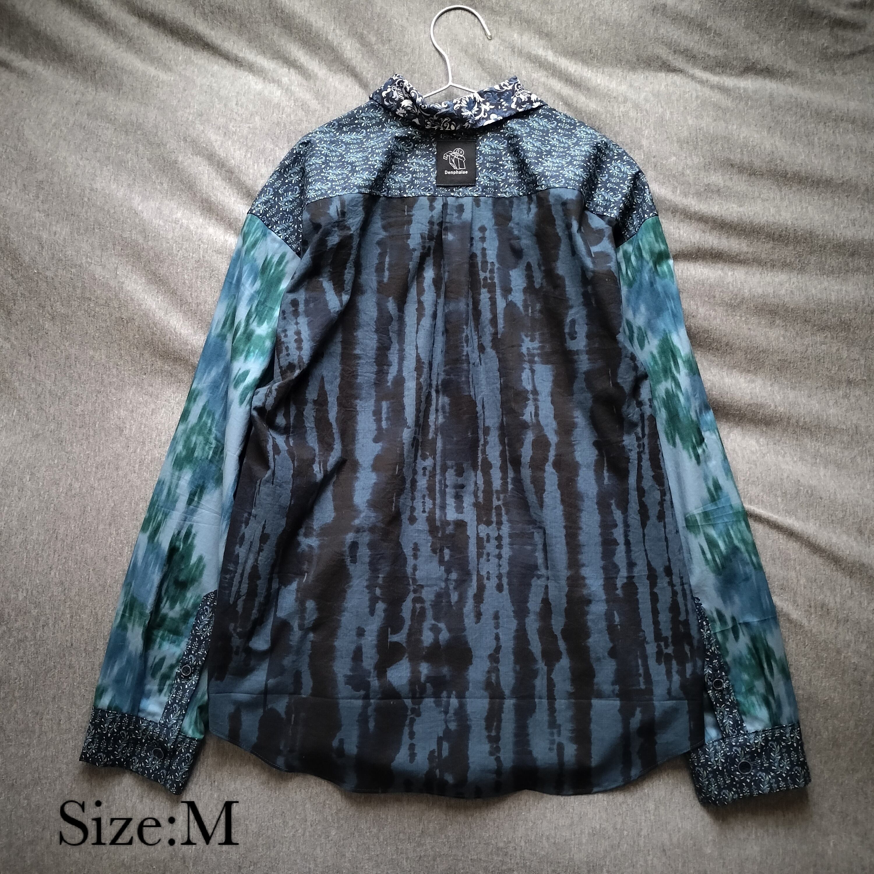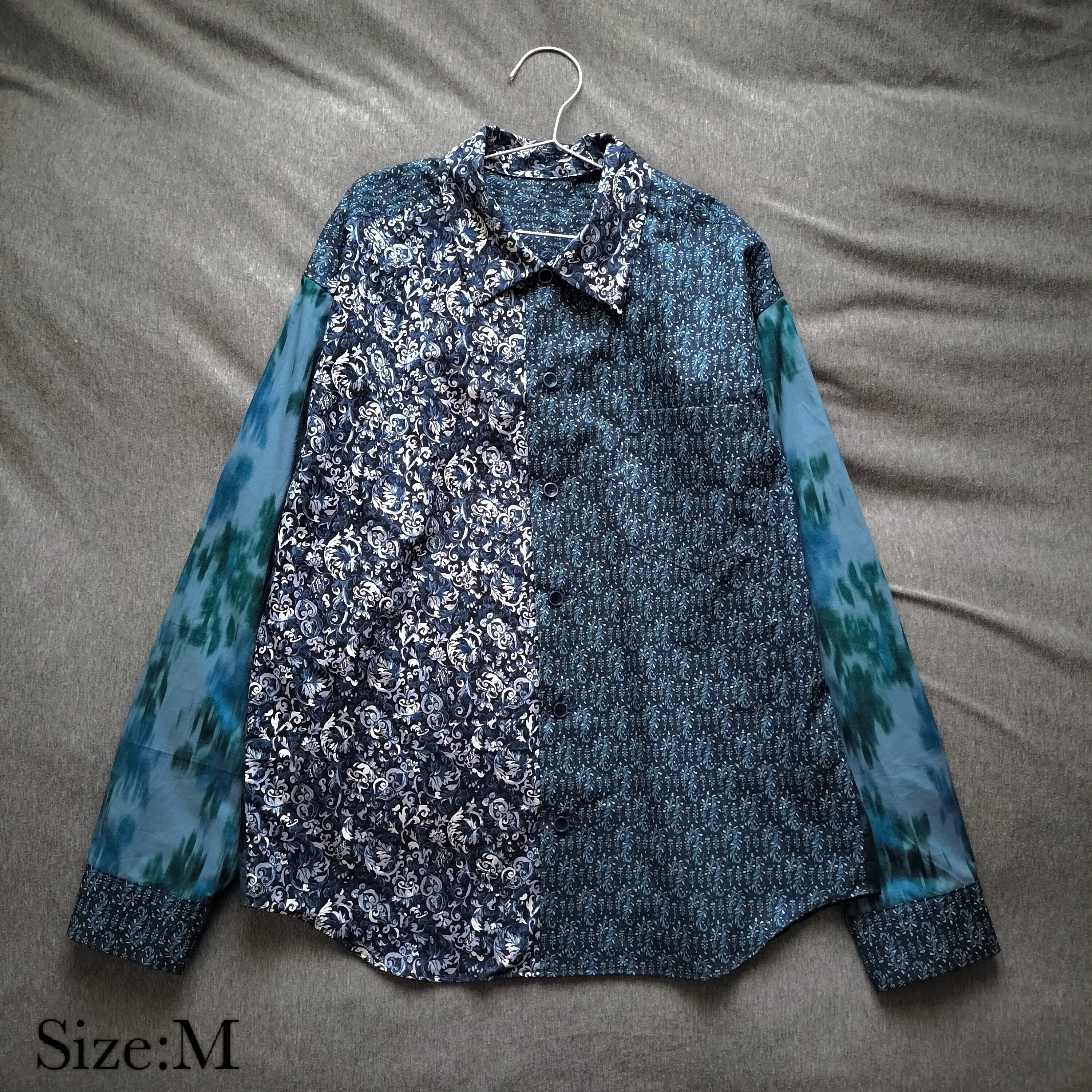 パッチワーク 青 柄シャツ 個性的 おしゃれ 一点物 男女兼用 綿 古着風 メンズファッション レトロ