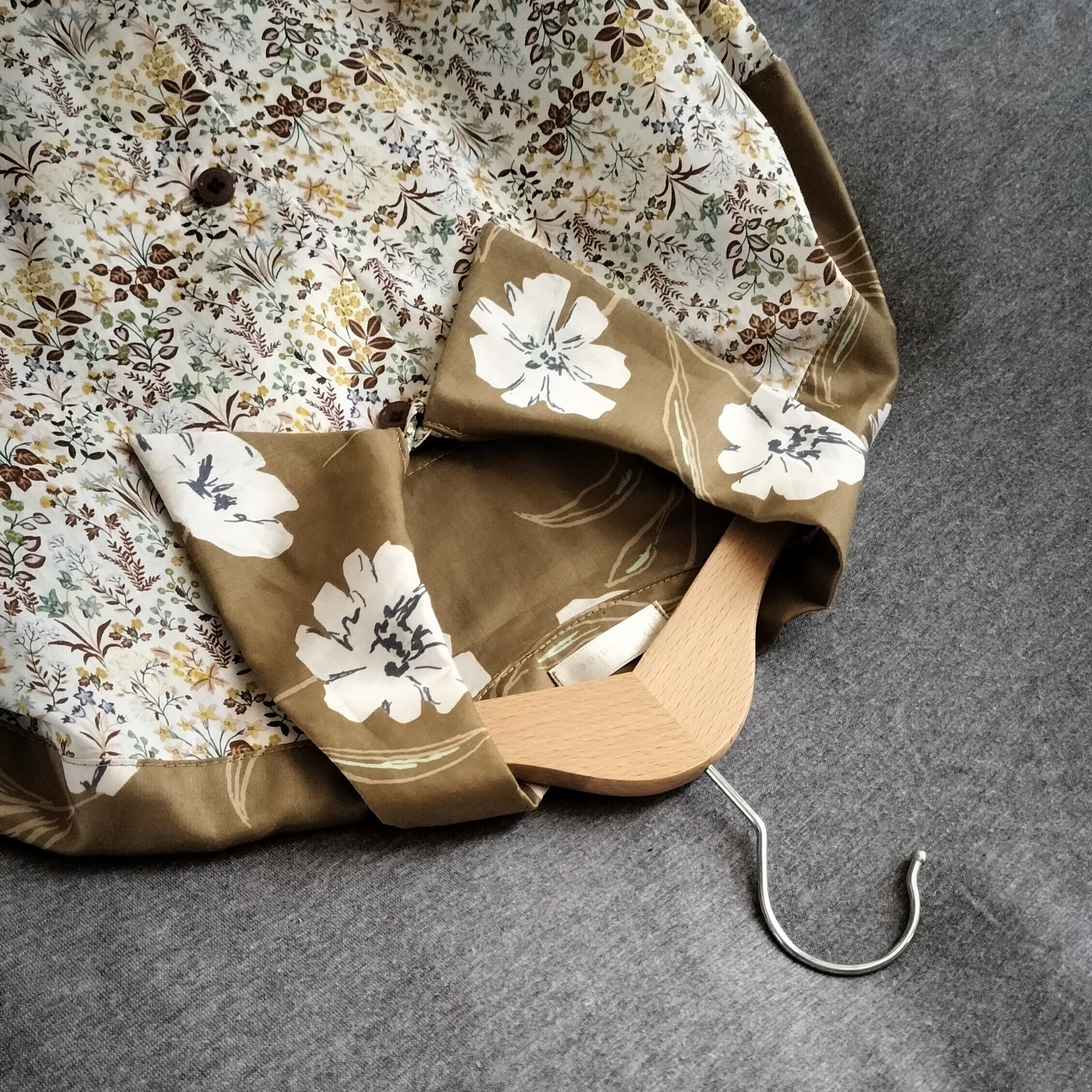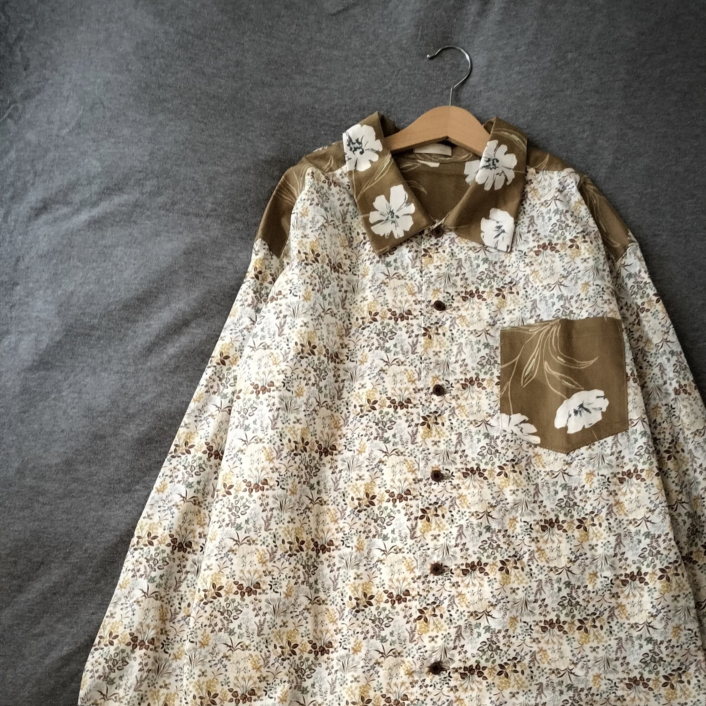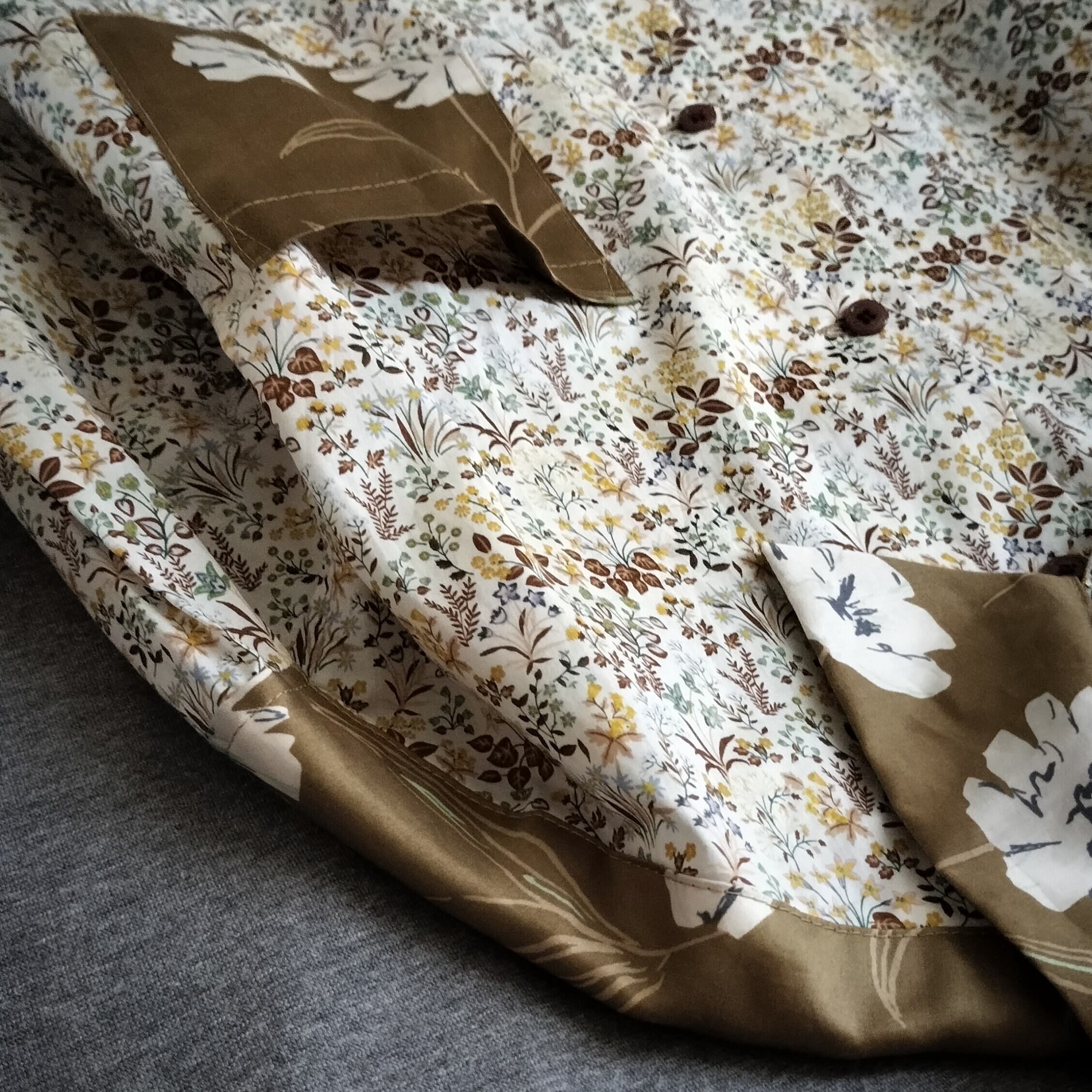 イエローベースの花柄生地を2種組み合わせた服。