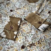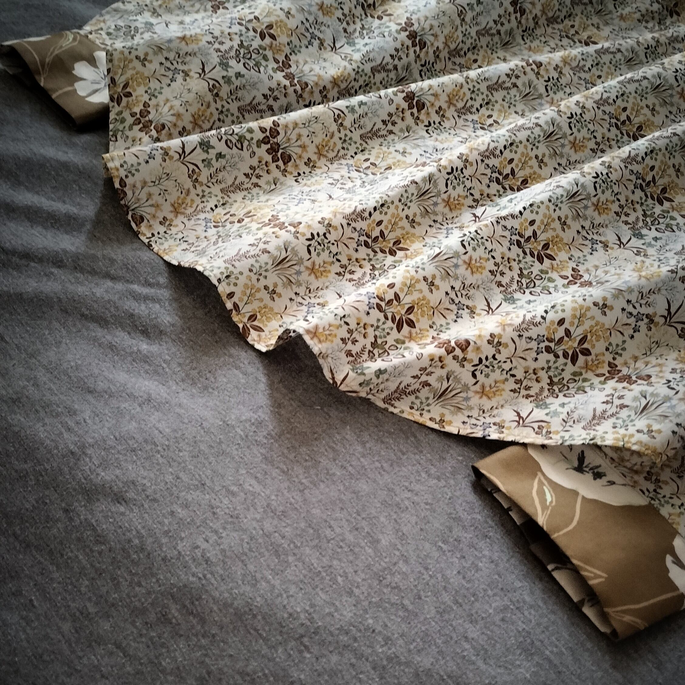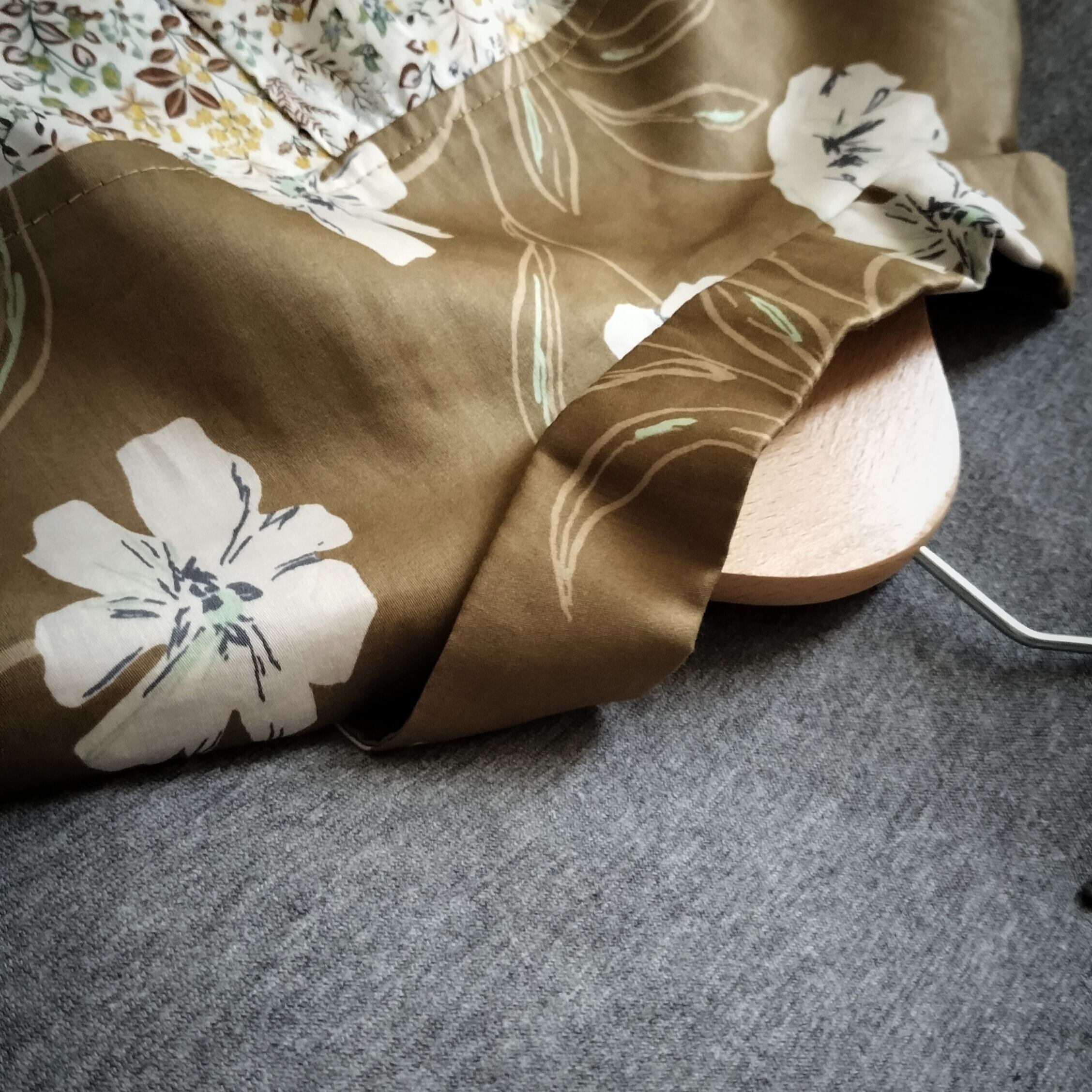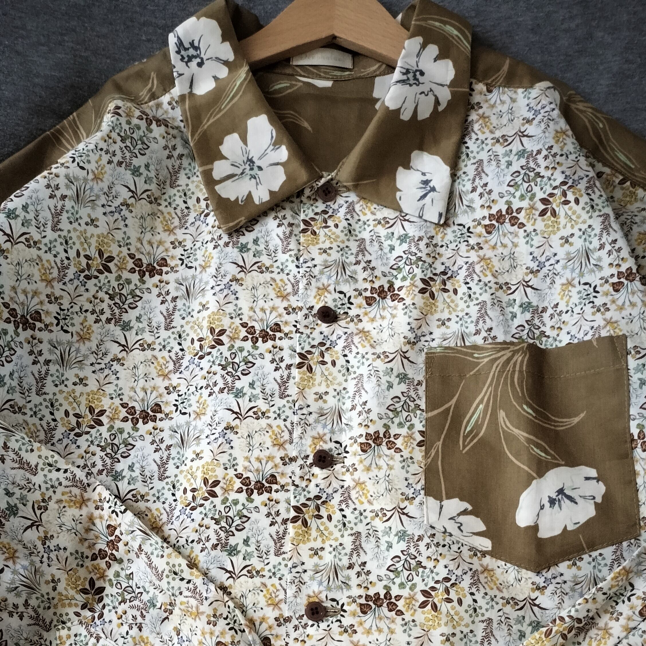イエローベースの花柄生地を2種組み合わせた服。